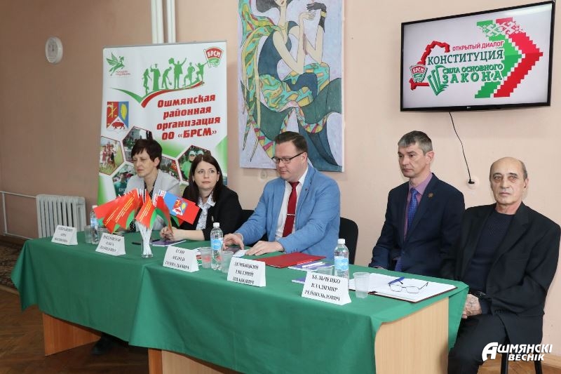 В Ошмянской детской школе искусств прошел открытый диалог по обсуждению нового проекта Конституции. С молодежью — представителями учреждений образования и трудовых коллективов района — встретился Андрей Есин, первый секретарь областного комитета ОО «БРСМ». На встрече также присутствовали первый секретарь Ошмянского райкома ОО «БРСМ» Виктория Прецкайло-Мисюта, начальник отдела идеологической работы, культуры и по делам молодежи райисполкома Ольга Шиловская, заместитель начальника управления образования Анна Амбражевич, председатель районного совета ветеранов Владимир Бельченко, заведующий юридической консультацией Ошмянского района Гродненской областной коллегии адвокатов Евгений Дембицкий.