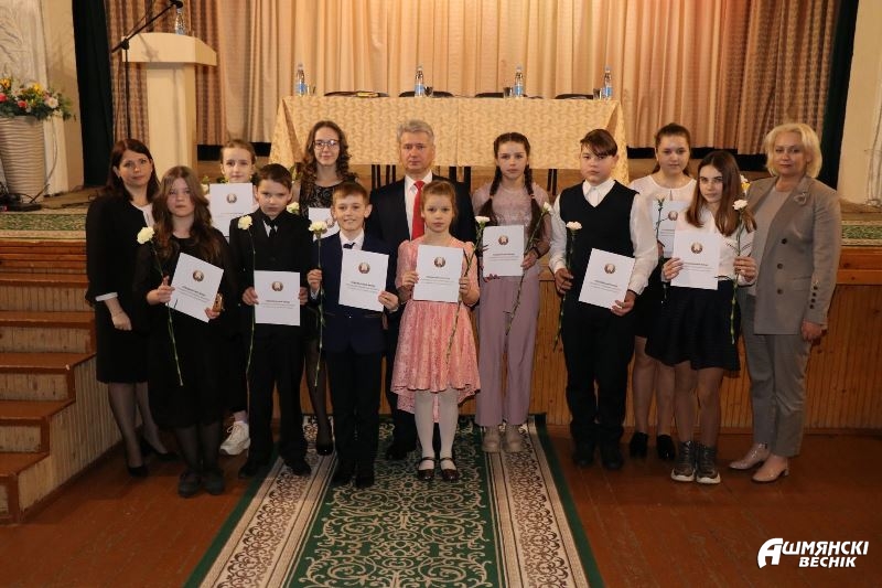 В торжественной обстановке юным ошмянцам, учащимся школ искусств были вручены свидетельства о присуждении поощрения специального фонда Президента Республики Беларусь по поддержке талантливой молодежи. Среди награжденных — Виолетта Безушко, Мария Воробьева, Никита Жабкевич, Доминик Захаревский, Виолетта Коваленок, Борис Криницкий, Ангелина Левковская, Ксения Левковская, Даниил Лосенок, Ульяна Петрина, Доминик Трот.