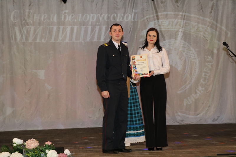 Руководитель района вручил Почетные грамоты районного исполнительного комитета старшему оперуполномоченному группы по борьбе с экономическими преступлениями Станиславу Красовскому, инспектору уголовно-исполнительной инспекции Роману Борисевичу, участковому инспектору милиции Дмитрию Черскому. Благодарности председателя районного исполнительного комитета удостоены оперуполномоченный отделения уголовного розыска Игорь Яковлев, заведующий группы защиты государственных секретов и документационного обеспечения Марина Олехнович, старший инспектор группы информационного обеспечения Оксана Кунявская. Почетной грамотой районного Совета депутатов награждена старший инспектор ИДН Елена Каморник. Благодарность председателя районного Совета депутатов объявлена главному бухгалтеру Татьяне Ринденок.