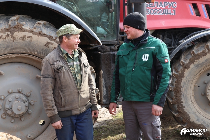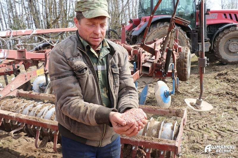 На сеялке возле Юршан работает механизатор Франц Черняк. На подвозе семян — молодой водитель Александр Млыновский. На загрузке семян в сеялку старательно трудятся полеводы Вера Ведута и Иван Зенкович. Здесь сеют яровую пшеницу на площади более 60 гектаров. Возле деревни Кулеши механизатор Владимир Петкевич ведет сев ярового ячменя. Его напарник Александр Габриялович занят на подвозе семян.