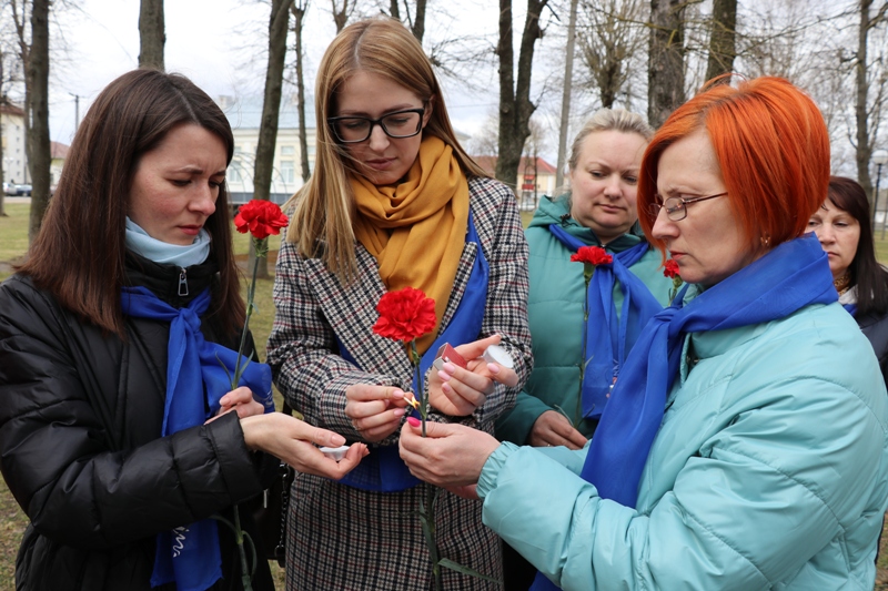 У братской могилы в городском парке прошла акция «Память», участие в которой приняли представители органов власти, общественных организаций, прокуратуры, учреждений образования района. Среди них заместитель председателя райисполкома Наталья Станкевич, начальник отдела идеологической работы, культуры и по делам молодежи Ольга Шидловская, первый секретарь райкома ОО «БРСМ» Виктория Прецкайло-Мисюта, помощник прокурора Олеся Левшунова. Также отдать дань памяти к мемориалу пришли школьники.