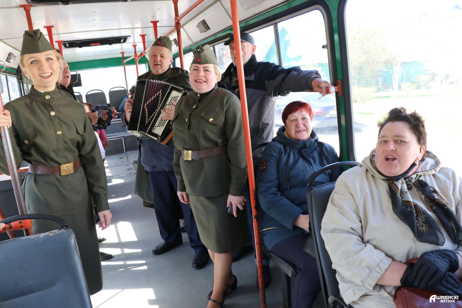 Другі год запар культработнікі ладзяць падобныя мерапрыемствы напярэдадні Дня Перамогі. Сёння першым па святочным маршруце адправіўся аўтобус № 4 («Аграпрамтэхніка — Ільнозавод»). Кожнага пасажыра артысты цэнтра культуры віншавалі з надыходзячым Днём Перамогі і прапаноўвалі падтрымаць іх агульнавядомымі песнямі.