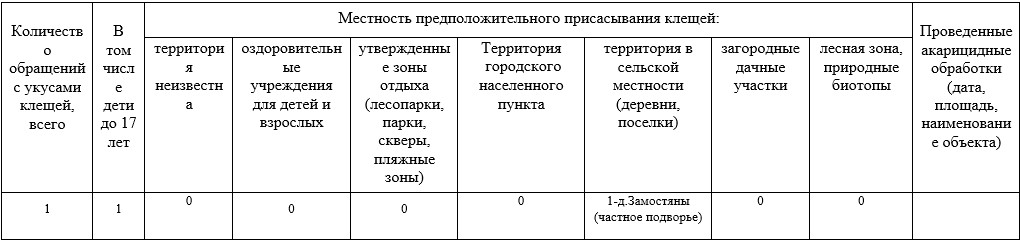 В 2022 году за период с 01.03.2022 по 04.05.2022 в учреждение здравоохранения «Ошмянская центральная районная больница» за медицинской помощью по поводу укуса клеща обратился 1 человек, он же ребенок до 18 лет.