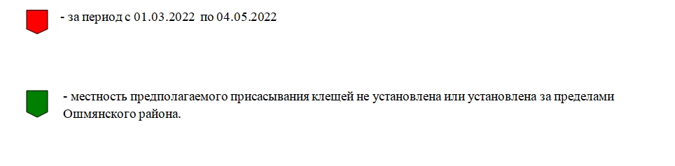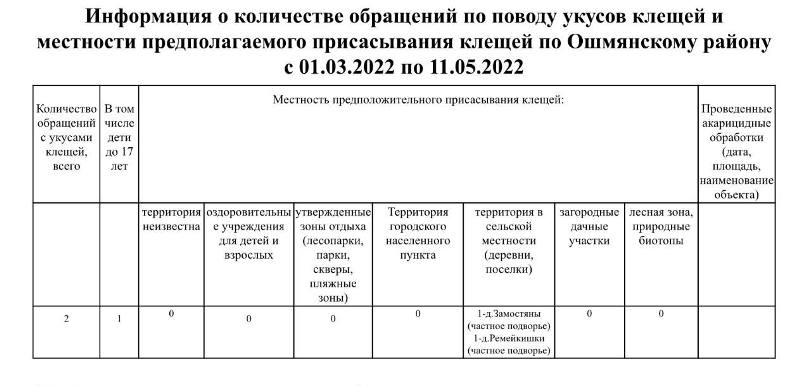 В 2022 году за период с 01.03.2022 по 11.05.2022 в учреждение здравоохранения «Ошмянская центральная районная больница» за медицинской помощью по поводу укуса клеща обратилось 2 человека, из них 1 ребенок до 18 лет.
