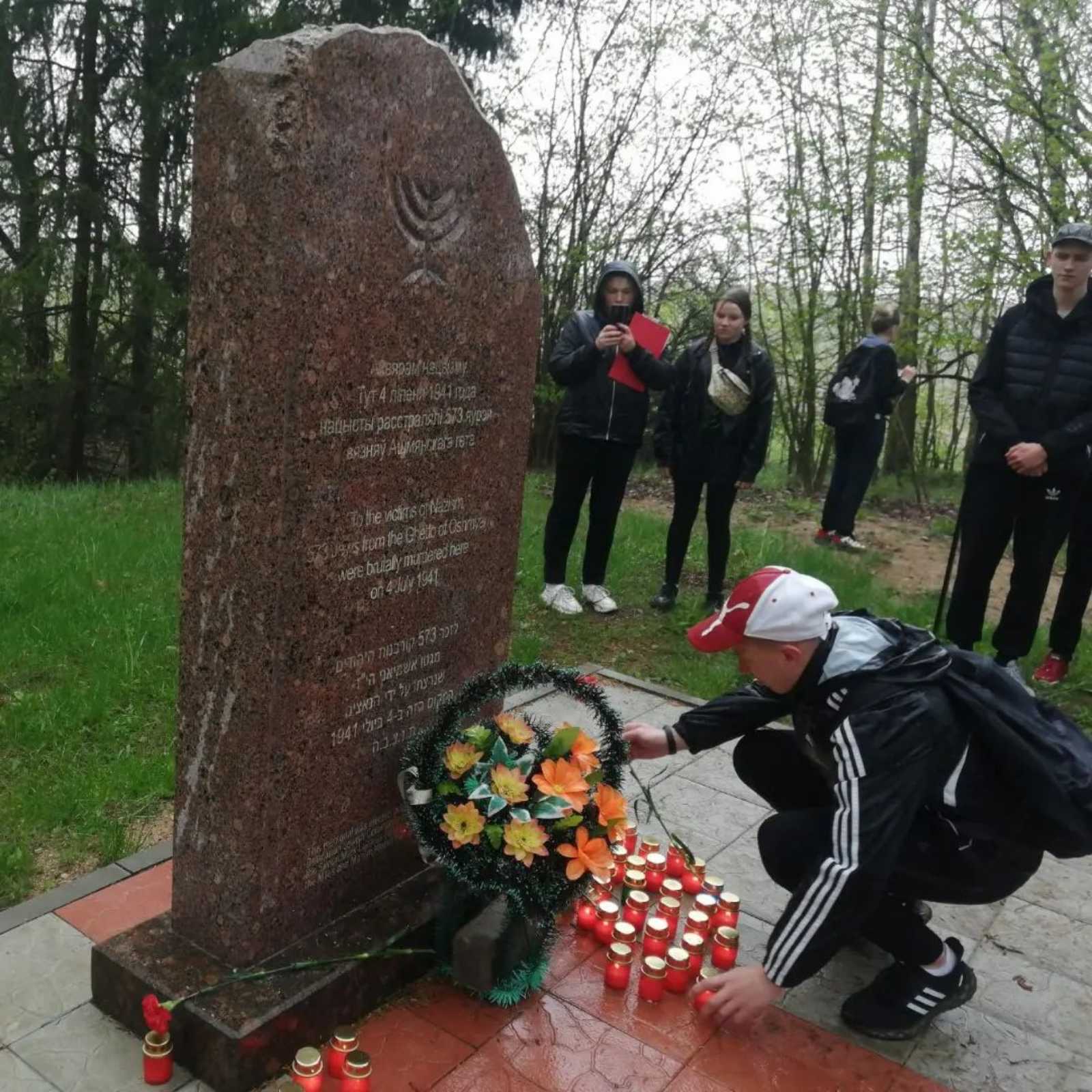 Прибыв в урочище Люговщина, у братской могилы они возложили соцветия красных гвоздик и зажгли лампадки. Там покоятся 573 жителя города, которые были расстреляны немецко-фашистскими захватчиками 3-4 июля 1941 года. На мемориальной доске, установленной в 1997 году, надпись «Вечная память 1 200 евреям – жителям Ошмян, расстрелянным немецкими фашистами и их помощниками 26 июля 1941 г.» «Вечная память павшим отцам, братьям, мужьям от рук фашистских людоедов».