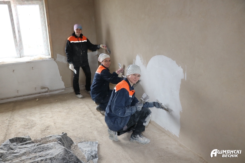На объекте каждый день трудится до 25 человек, в зависимости от плана строительства. Ответственно и грамотно работают строители Сергей Зык, Павел Манько, Игорь Куприянчик, Николай Можейко, женская бригада отделочников — Марина Пашникович, Антонина Атрашкевич, Юлия Дервис.