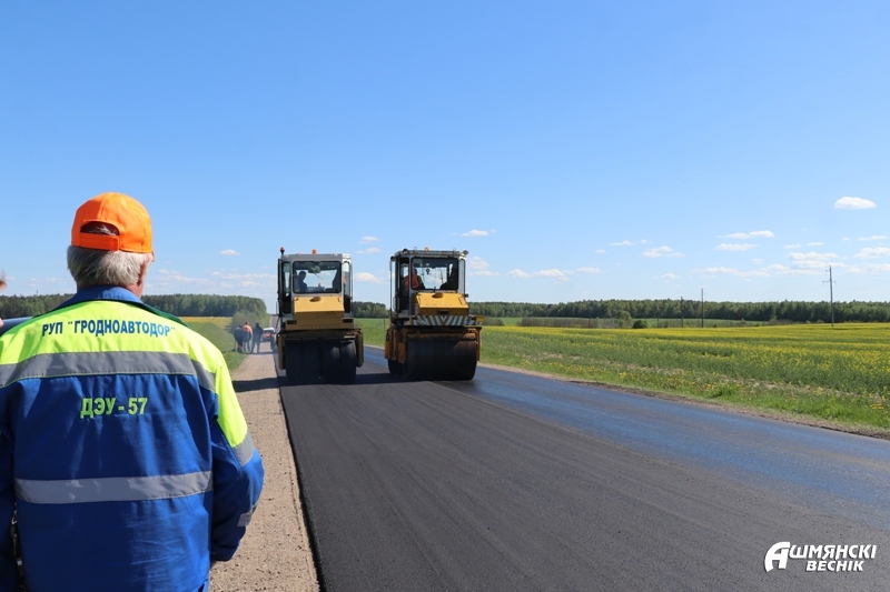 Работа на объекте не прекращается ни на минуту. Машинист гудронатора Иван Лисовский производит подгрунтовку дорожного полотна. Помогает ему в этом водитель Иосиф Гайдукевич, который вовремя подвозит воду. Укладкой асфальтобетонной смеси занимаются машинисты асфальтоукладчика Александр Ярмакович и Олег Игнатенко. То, что не под силу современной технике, берут на себя дорожные рабочие ДЭУ-57 Николай Ситарук, Сергей Павилович и Станислав Рабцевич. Практически без остановки курсирует по дороге на самоходном катке Сергей Микишко.