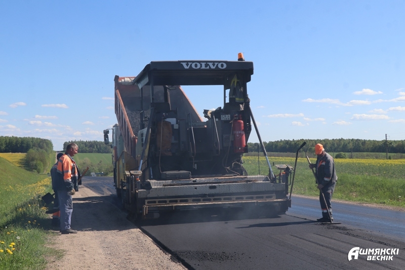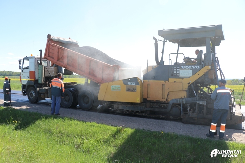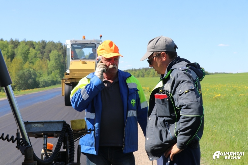 Из разговора с профессионалом-дорожником узнаем, что вместе с работниками ДЭУ-57 трудятся на данном участке специалисты еще одной ошмянской дорожной организации – ДСУ-28: именно у этих коллег управление арендует технику для укладки асфальтобетонной смеси. К слову, материалы для работы также поставляет ДСУ-28 – возле Жупран находится асфальтобетонный завод.