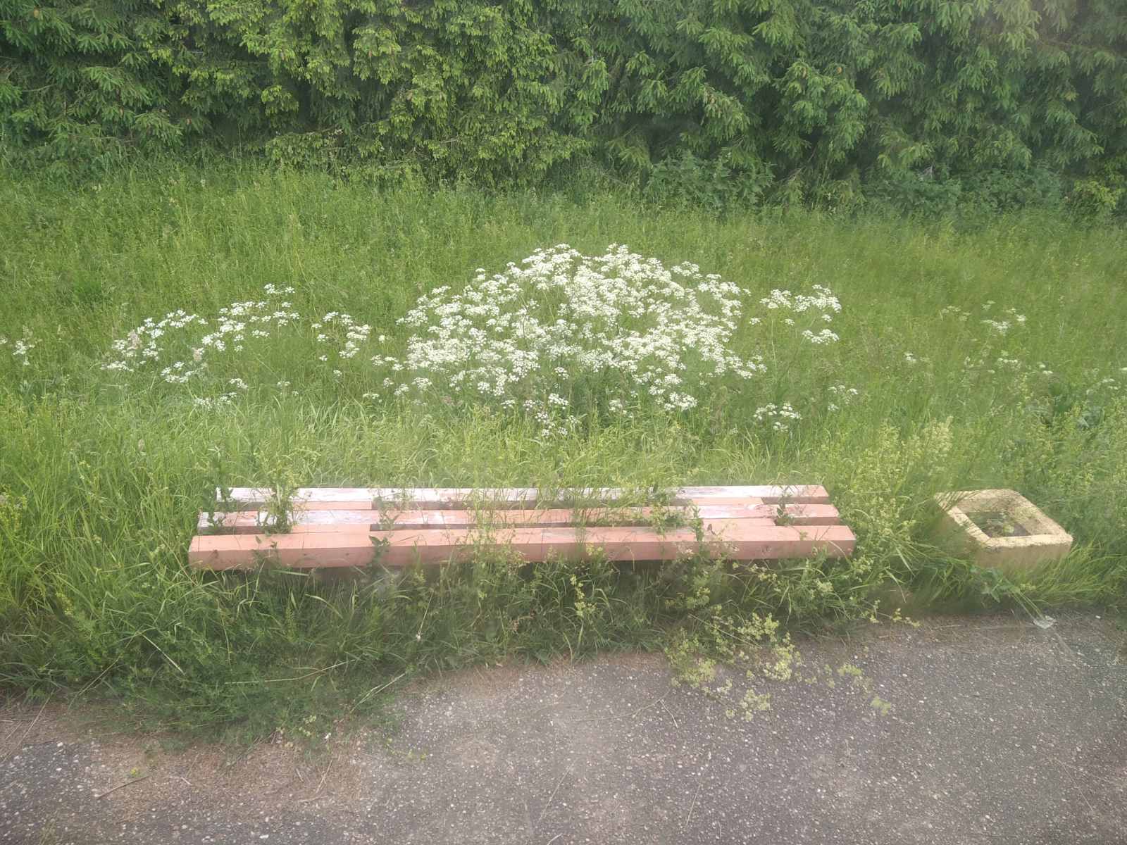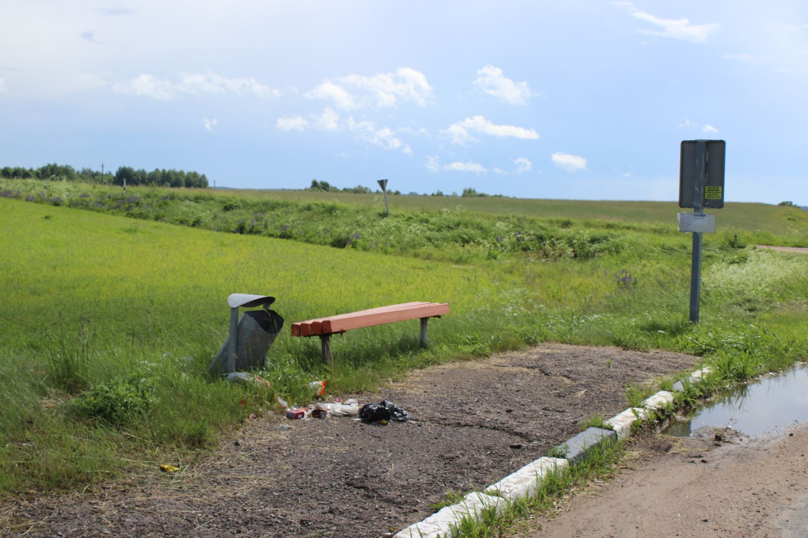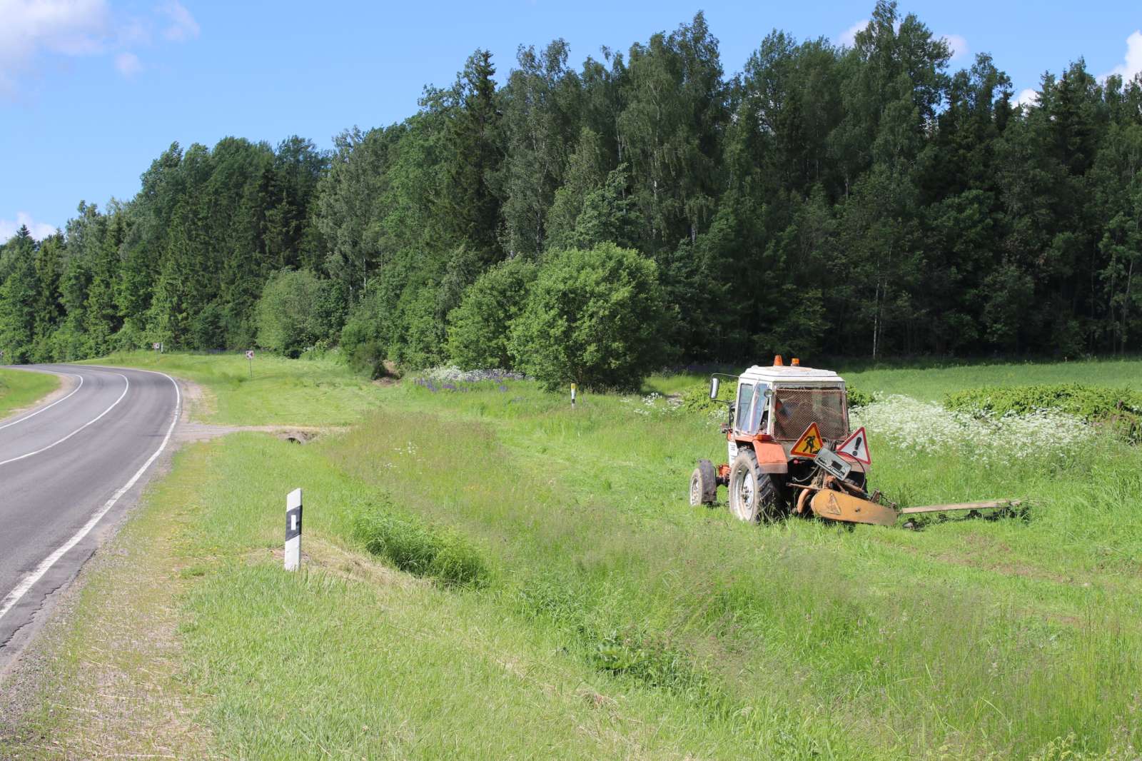 На дарозе Гальшаны — Ашмяны за касьбой сустрэлі тэхніку ДЭУ-57, а вось у накірунку на Станцыю Ашмяны работы, па ўсёй бачнасці, ужо завершаны. Прыдарожныя палосы тут нядаўна абкошаны, а вось прыпынкі… На адным з іх (размешчана таблічка «Па патрабаванні») лаўкі хутка будзе не відаць за травой. Хочацца спадзявацца, што дбайная рука з касой паклапоціцца і пра такія астраўкі.