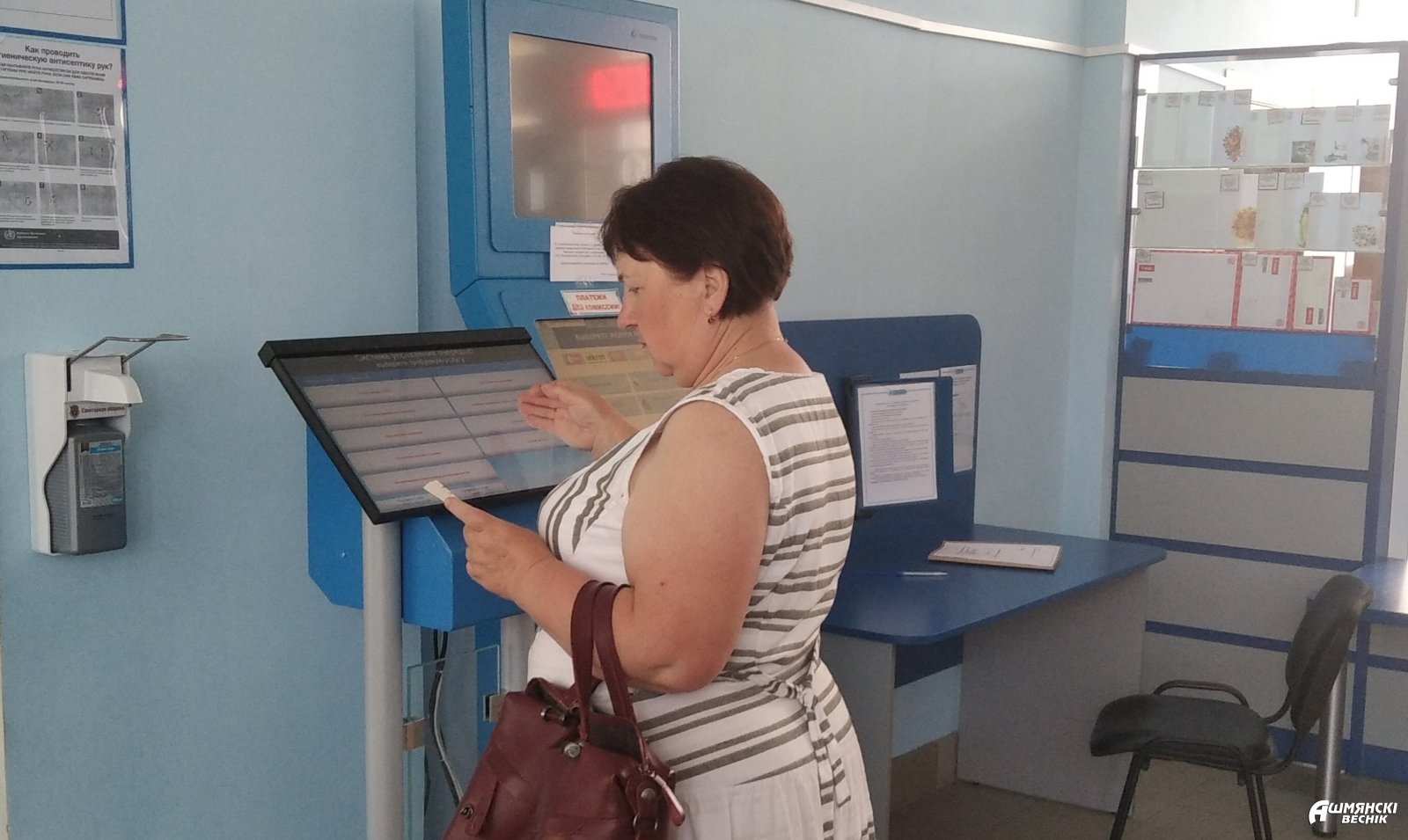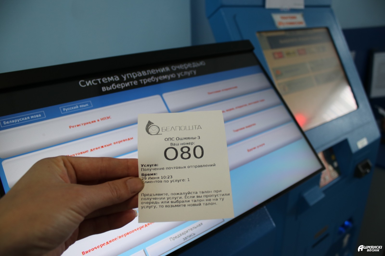 — Это сделано для удобства клиентов. Теперь нет необходимости занимать очередь, достаточно выбрать на терминале необходимую услугу, получить талон с номером и дождаться, когда вас пригласят, — рассказывает начальник Ошмянского участка почтовой связи Сморгонского регионального УПС Лилия Сергей.