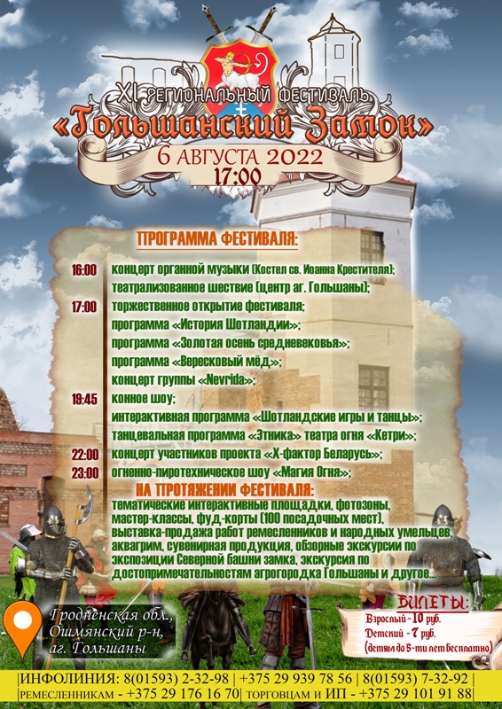 На протяжении мероприятия на территории также будут работать тематические интерактивные площадки, фуд-корты, детская развлекательная зона, обзорные экскурсии по Северной башне и достопримечательностям Гольшан. Приглашаем всех 6 августа 2022 года на очередную встречу возле стен Гольшанского замка!
