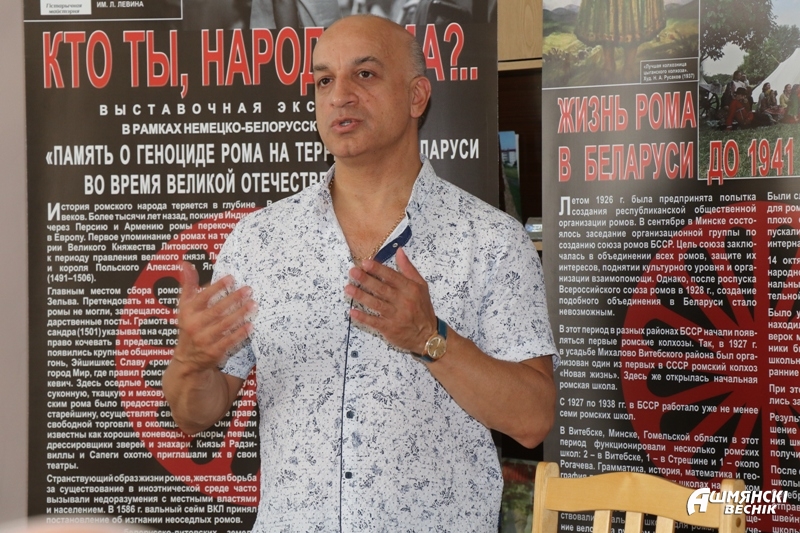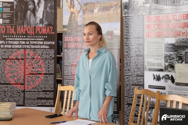 В Ошмянской районной библиотеке состоялось открытие выставочной экспозиции «Кто ты, народ рома?…» в рамках немецко-белорусского проекта «Память о геноциде рома на территории Беларуси во время Великой Отечественной войны». В мероприятии приняли участие заместитель председателя райисполкома Юрий Снесарь, начальник отдела идеологической работы, культуры и по делам молодежи Ольга Шидловская, вице-председатель Белорусской цыганской диаспоры Артур Гомонов, представители немецкого образовательного центра «За мир» Пауль Гислер и Утте Френкис, художественный руководитель Республиканского центра национальных культур Елена Гостева, а также представители цыганской общины в Ошмянах во главе с руководителем Артуром Егоровым, работники библиотеки, местные жители.