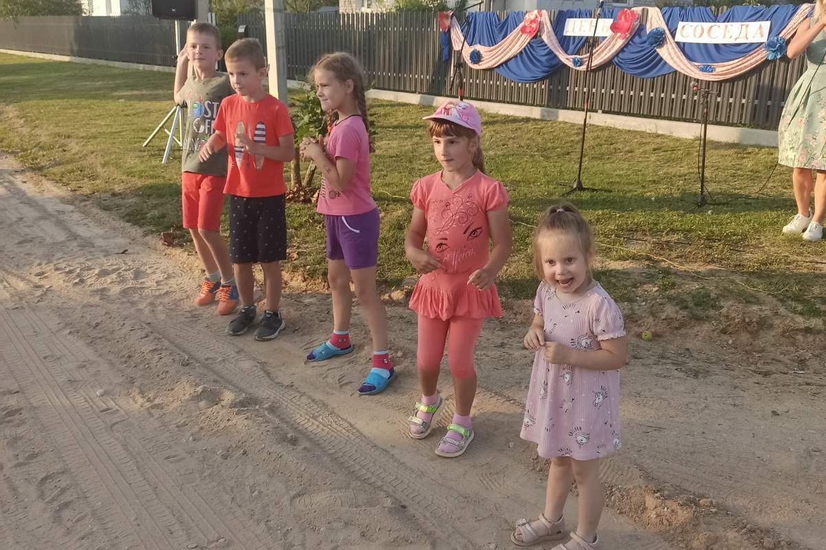 Здесь праздновали «День соседа». В агрогородке — 19 улиц. Жители улиц Комсомольская, Интернациональная решили в этом году проявить инициативу и первыми открыть праздник по-соседски. Они начали собираться дружно: вынесли стулья, лавочки, организовав таким образом уличный зрительный зал. А напротив расположилась импровизированная сцена.