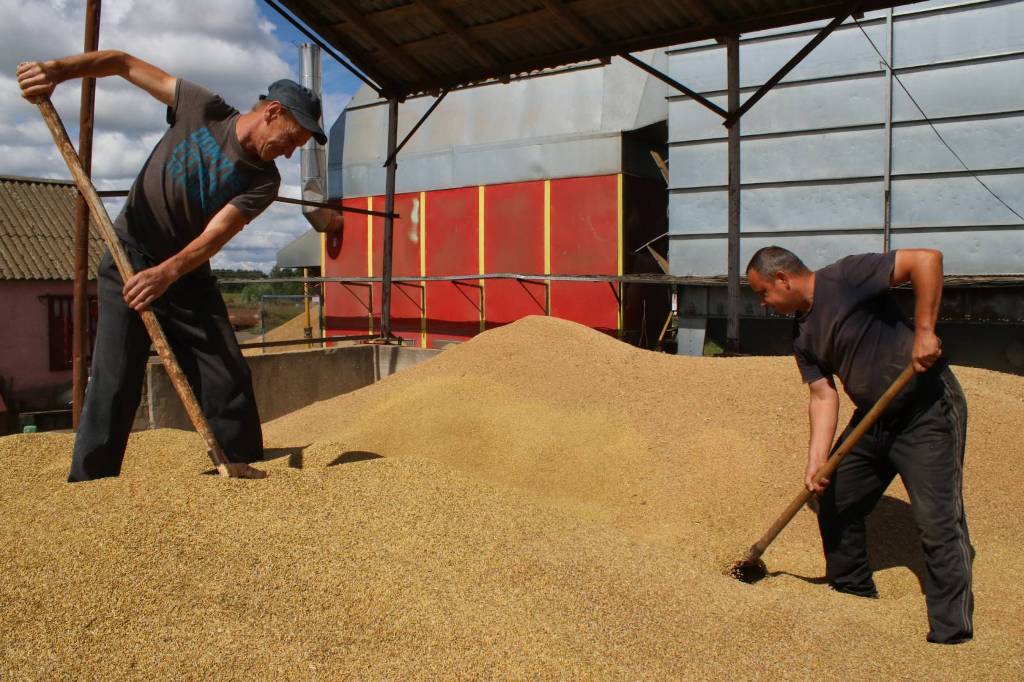 Первая точка в маршруте — зерносушильный комплекс в Повишнях. В воздухе витает аромат свежего зерна, урожай лежит на площадке перед сушилкой. Работники комплекса Иван Дасюкевич и Виталий Быцко каждый час проверяют показатели температуры и добавляют свежее зерно на просушку.— На площадке — горы тритикале, ячменя. Зерно поступает с различной влажностью, все зависит от погоды. Сушилка работает на газе, за сутки просушили около 120 тонн, — рассказывают аграрии.