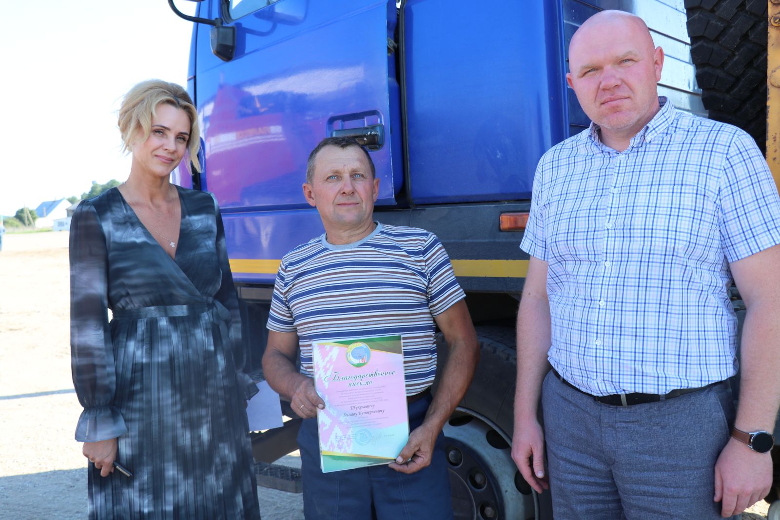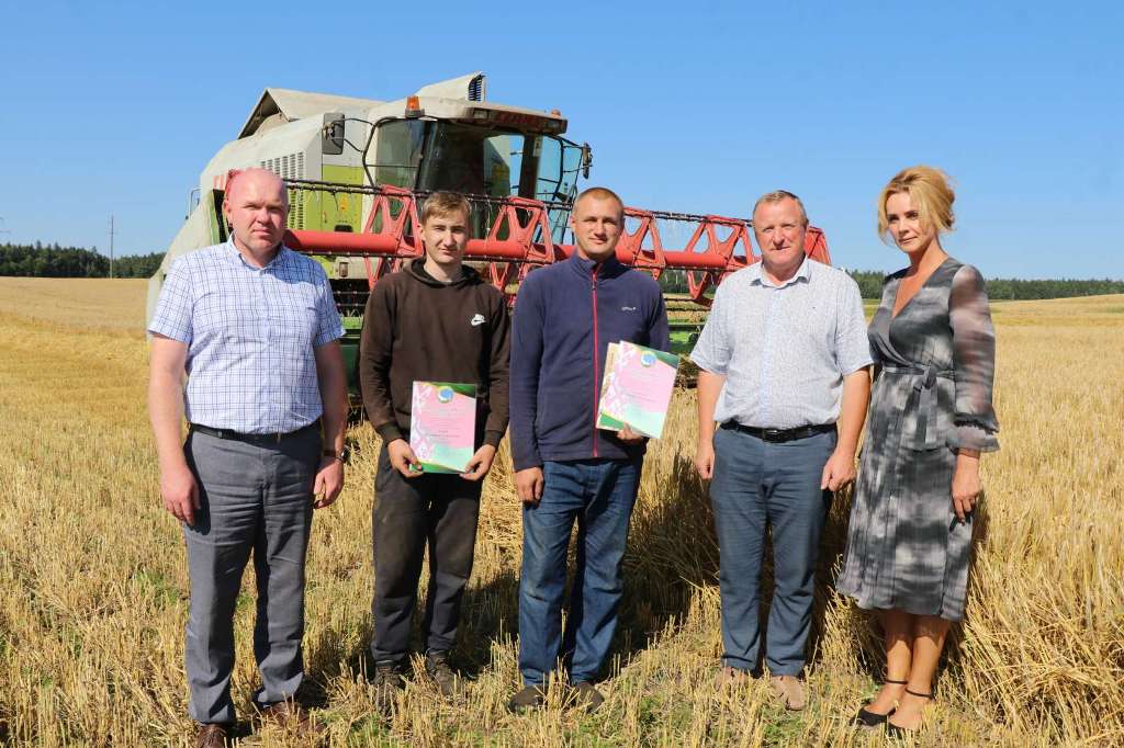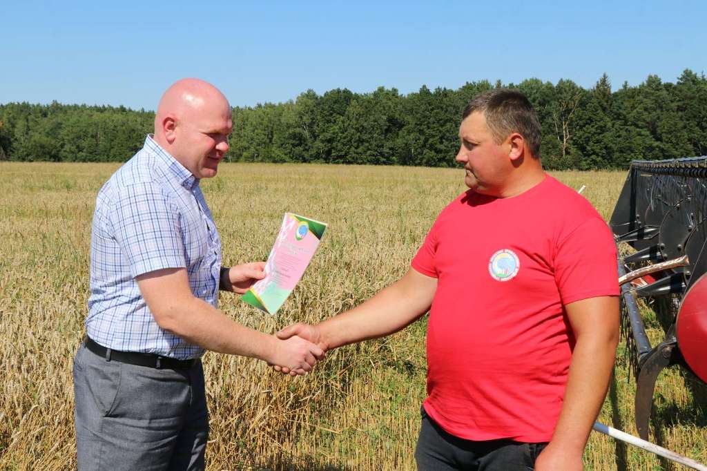 Экипаж комбайна «Мега-208» встретили, как обычно, в поле. Здесь состоялась церемония чествования. С этим достижением комбайнеров поздравил первый заместитель председателя Ошмянского райисполкома Андрей Гордей.