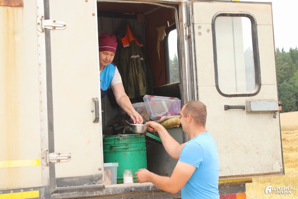 Перапынак спорнай працы робіць хіба што абед. Акурат на поле пад’язджае аўтамабіль Ашмянскіх электрычных сетак, якія аказваюць дапамогу гаспадарцы падчас жніва. Механізатары ўжо ведаць, што прывезлі абеды.