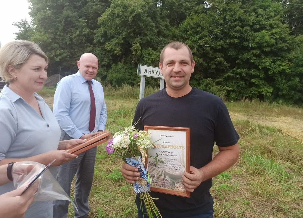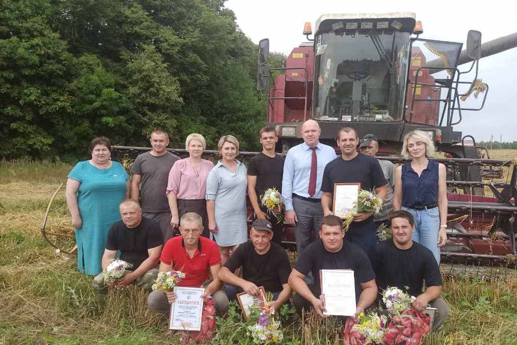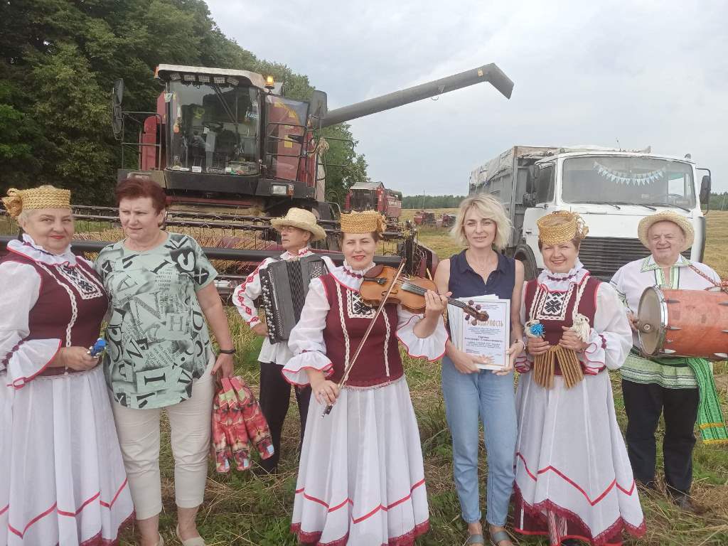 Далее встреча продолжилась в КСУП «Краковка». Комбайнеры и участники жатвы целенаправленно движутся к завершению уборки зерновых. Осталось совсем немного и краковские намолоты дополнят районный каравай. В поле возле деревни Анкуды состоялась встреча комбайнеров с профсоюзными активистами Раисой Турлай, Лелой Шпак, начальником райсельхозпрода Андреем Гордеем, руководителем хозяйства Светланой Авсюкевич. К ним присоединились работники культуры агрогородка Краковка. Лела Шпак, руководитель областной профсоюзной организации работников образования и науки, поблагодарила сельчан за труд и вручила благодарственные письма и подарки за активное участие в уборке урожая и достигнутые трудовые успехи комбайнерам Дмитрию Предко, Александру и Валерию Суровцам. Руководитель хозяйства Светлана Авсюкевич отметила лучших тружеников жатвы и вручила им денежные премии. В короткой беседе с механизаторами Андрей Гордей, начальник райсельхозпрода, выразил убеждение, что уборка зерновых в хозяйстве будет успешно завершена в самый сжатый срок. Прямо в поле, во время короткого перерыва для участников жатвы состоялась мини-концертная программа, подготовленная работниками культуры.