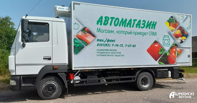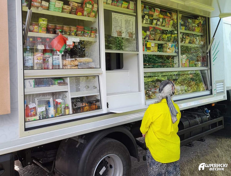 Новый магазин на колесах местные жители высоко оценили. Холодильная и демонстрационная витрины с правой стороны кузова позволяют покупателям рассмотреть почти весь ассортимент предлагаемой продукции. То, что не разместилось в витрине, располагается в холодильном шкафу, на хлебных лотках, стеллажах внутри кузова. Ольга Юшкевич довольна новыми условиями для работы, она ловко передвигается внутри своего магазина, предлагая покупателям нужный им товар. В автомагазине у нее более ста наименований продукции: от хлебобулочных и колбасных изделий до чипсов, мороженого и фруктов. Продавец уже изучил спрос своих покупателей и наверняка знает, кто и что будет покупать. Сейчас — время консервирования овощей, поэтому особым спросом пользуются сахар, уксус, соль, подсолнечное масло. В жару покупают холодный квас и мороженое. Всегда пользуются спросом хлебобулочные и молочные изделия. Если какой-то ходовой товар, к примеру, сахар, заканчивается, а впереди еще несколько населенных пунктов, то автолавка заезжает в ближайший по дороге магазин Ошмянского филиала и дополняет недостающий ассортимент. Автомагазины принимают предварительные заказы на непродовольственную группу товаров: стройматериалы, мебель, бытовую технику.