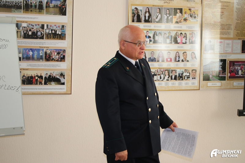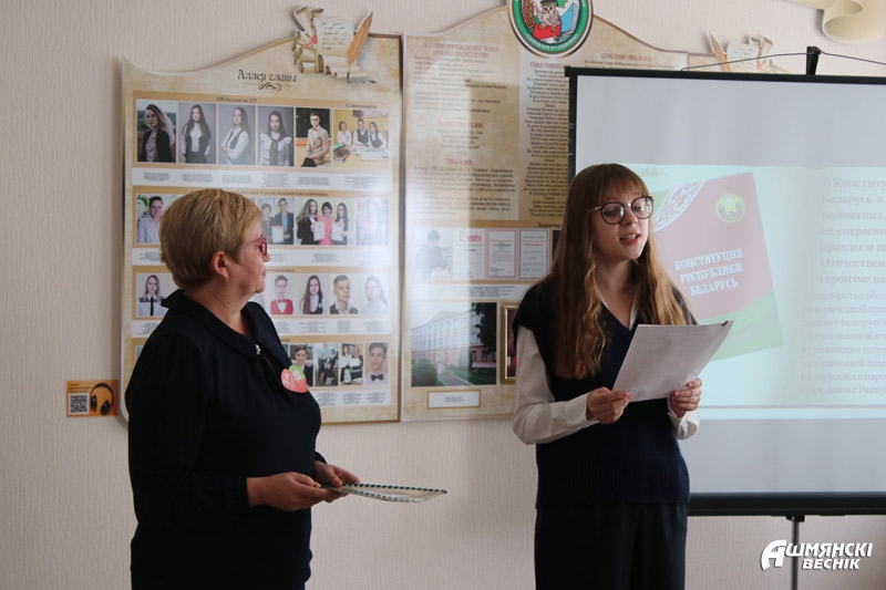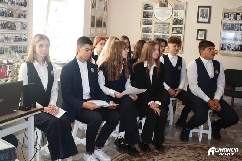 Особенным и волнительным он был для десятиклассников гимназии №1 и их классного руководителя Ларисы Ларионовой, потому что в гости к ним пришли председатель Ошмянского райисполкома Владислав Гершгорин, прокурор Ошмянского района Сергей Ковальчук, начальник управления образования Светлана Барковская и директор гимназии Ольга Саванец.