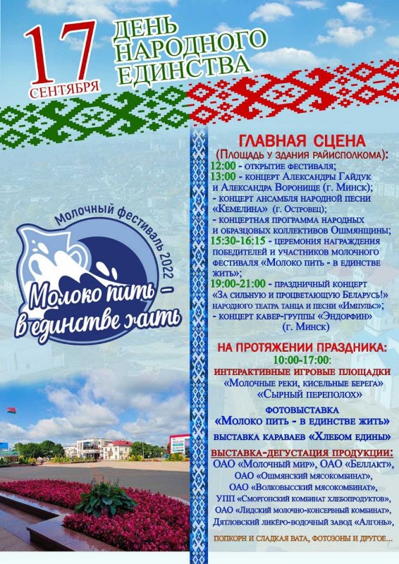 Для жителей райцентра и гостей этот день запомнится вдвойне, так как пройдет еще и под знаком молочного фестиваля «Молоко пить — в единстве жить». Праздник состоится 17 сентября в 12.00 на площади у здания райисполкома.