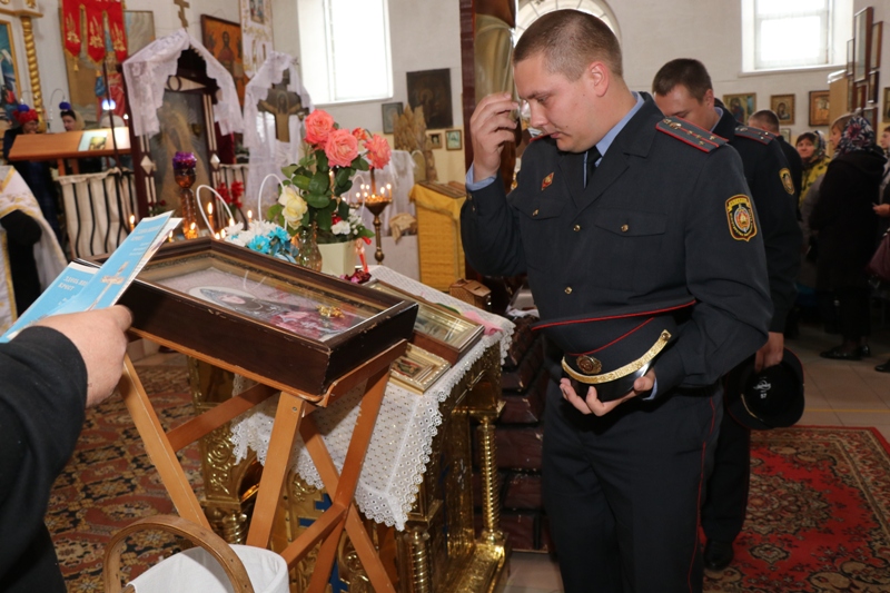 Посетили реликвии и церковь Воскресения Христова нашего города. В богослужении приняли участие сотрудники Ошмянского РОВД, которые, отложив важные дела, пришли в этот день помолиться вместе с прихожанами. Отец Сергий отслужил молебен. После окончания он обратился к присутствующим, поблагодарил сотрудников РОВД за добросовестную службу, за мир и спокойствие на наших улицах, вручил им иконки Матери Божьей Жировичской и благословил их на дальнейшую службу. Далее каждый мог поклониться святыням.