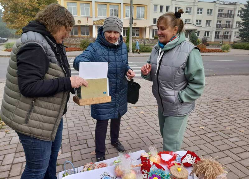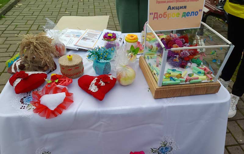 Марафон добра подхватили работники и воспитанники отделения дневного пребывания для инвалидов. Они давно готовились к акции «Доброе дело», приготовив своими руками разнообразные сувениры-подарки: салфетки, баночки для сыпучих продуктов, ростки комнатных растений, игольницы, шкатулки. Все это было разыграно в беспроигрышной бесплатной лотерее, которая проходила у кинотеатра на улице Советской. И снова светились улыбками лица, звучали благодарности и поздравления, люди благодарили, делились наболевшим. Работники центра предлагали жителям города познакомиться с услугами центра социального обслуживания населения Ошмянского района и раздавали буклеты с полезной информацией. Акция «Доброе дело» удалась.