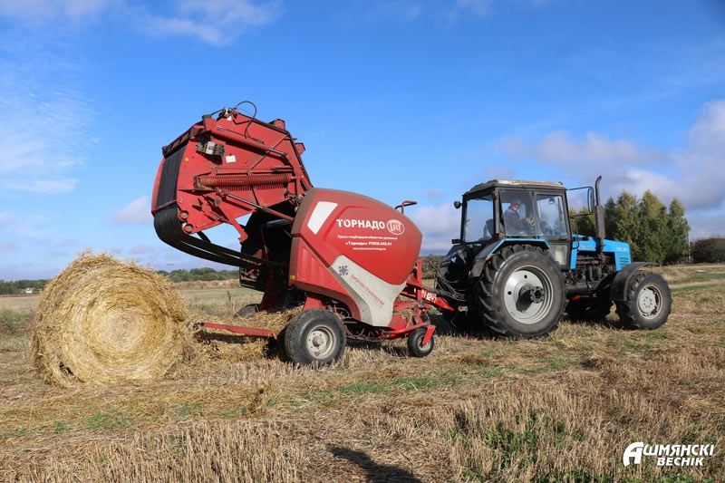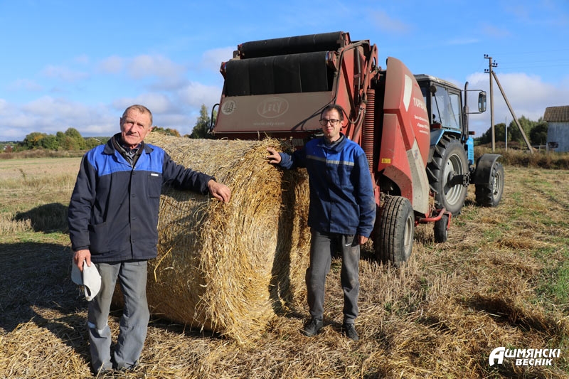 С механизаторами Геннадием Метлицким и Эдмундом Бернатом встретились в поле возле Горецковщины. Здесь работники ловко и оперативно двумя пресс-подборщиками прессовали солому в рулоны. Сухая погода позволяла сельчанам трудиться без лишних остановок, и рулон за рулоном по кругу распределялись там, где притормаживал трактор.