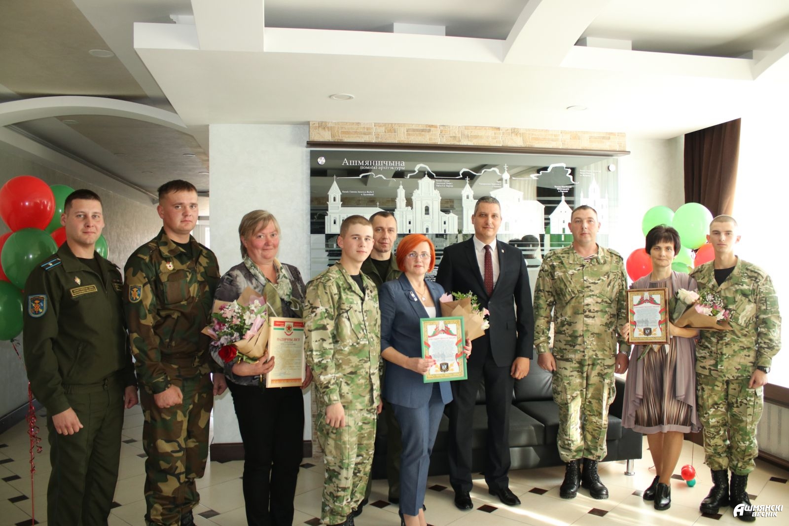 Благодарности в этот день принимали матери, чьи дети достойно исполняют долг по защите Отечества, проходя службу в Вооруженных Силах Республики Беларусь. Начальник службы гражданско-патриотического воспитания военной части 7434, майор Павел Ковкин вручил благодарственные письма Марине Куликович и Марине Кришталь. От имени командования войсковой части 97106 заместитель председателя командира Александр Стракович вручил благодарственное письмо Тересе Шлемпо.