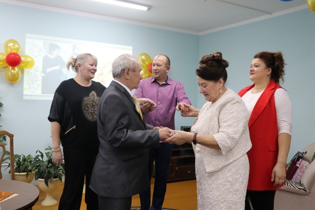 Супруги Гружевские место для проведения торжественной церемонии выбрали для кого-то, может, и необычное, но для себя вполне объяснимое. Отделение дневного пребывания для граждан пожилого возраста территориального центра социального обслуживания населения стало с недавнего времени неотъемлемой частью жизни семейной пары. Людвига Станиславовна является активной посетительницей этого учреждения. Здесь она занимается скандинавской ходьбой и йогой, проявляет свой певческий талант, участвует в работе волонтерского движения… Но самое главное – здесь она встретила друзей не только по интересам, но и по мироощущению. Поэтому неудивительно, что с ними в том числе Людвига Станиславовна захотела разделить радостное событие своей жизни.