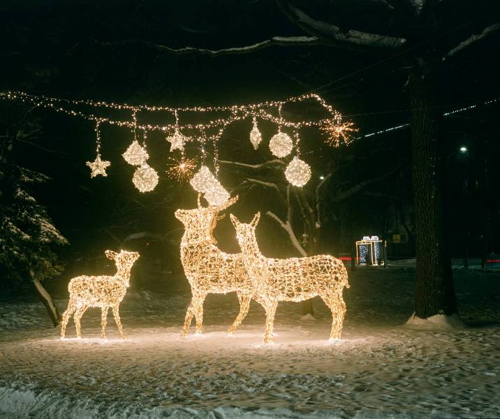 Для украшения новогодних елей вне помещений — фасадов домов — должны использоваться сертифицированные гирлянды только заводского изготовления и иметь более надежную защиту от попадания влаги и пыли, с напряжением питания не более 25В. В противном случае высота подвеса должна быть не менее 2,5 метра или елка должна ограждаться, чтобы люди не могли попасть в зону ее установки.