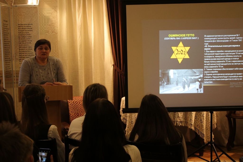 Встречу открыла директор ошмянского музея Анастасия Новицкая, рассказавшая об истории жизни людей еврейской национальности на Ошмянщине, в том числе в годы оккупации. Отмечалось, что перед войной в Ошмянах проживало более 8,5 тысячи жителей, из которых половина — еврейской национальности. Среди жителей никогда не было вражды. Настоящая трагедия случилась в 1941-1942 годах. Во время оккупации фашисты в Ошмянах создали гетто — место, где еврейское население подвергалось нечеловеческим испытаниям. Созданы были гетто в Гольшанах, Борунах, Жупранах. Людей ежедневно подвергали пыткам, гоняли на тяжелые работы, а кто пытался бороться и сопротивляться — расстреливали.