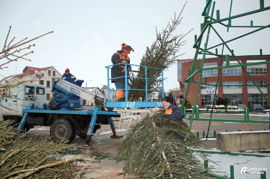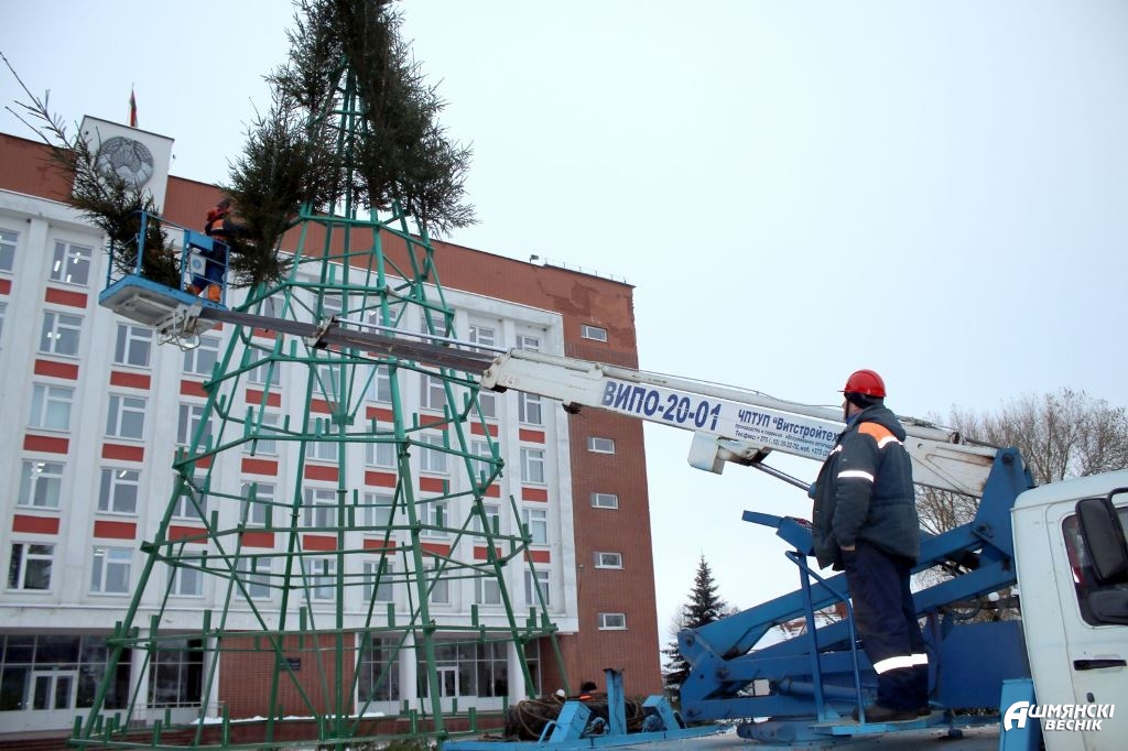 Установкой главной городской елки занимаются работники ЖКХ Владимир Онюховский, Геннадий Барковский, Виталий Карчевский.