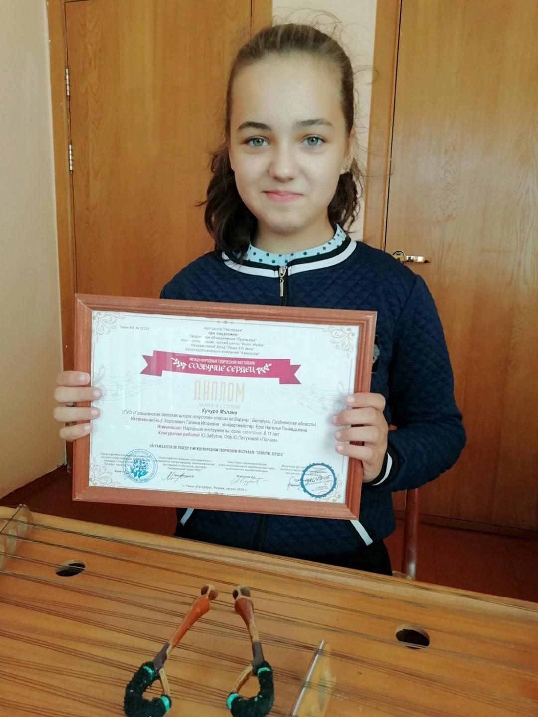Международная олимпиада по предмету «Сольфеджио» порадовала учеников Оксаны Олешкевич. Полученные в процессе учебы знания помогли Виктории Юревич и Виктории Кончиц стать лауреатами II степени. В очередной раз ярко заявил о себе на международном уровне дуэт баянистов в составе Виктории Каневки и Елизаветы Яскель. Ученики Инны Гайдукевич на международном конкурсе искусств «Хрустальный василёк» награждены дипломом лауреата II степени. Ангелина Левковская удостоена диплома лауреата III степени.