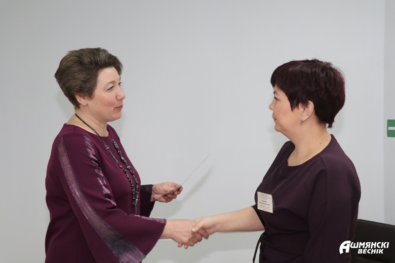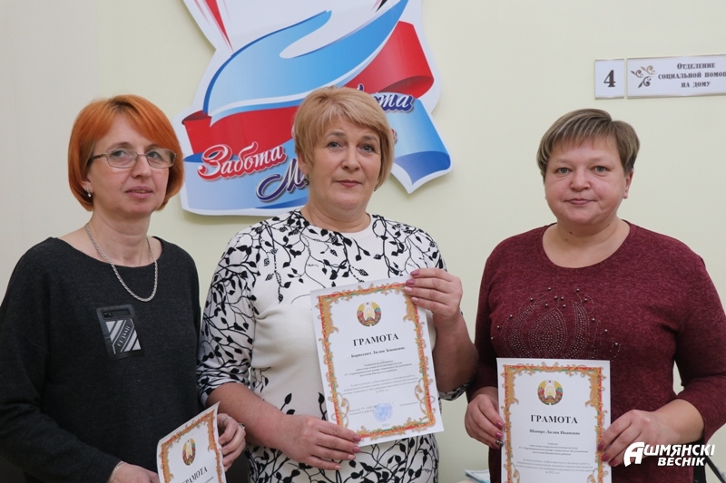 За успехами и положительными моментами стоит труд коллектива, который ежедневно делает свою работу качественно и ответственно. Социальные работники, сиделки, руководители кружков и секций, экономисты – эти и многие другие специалисты работают на благо общества. А добросовестный труд всегда должен поощряться. Наталья Станкевич, Ирина Губарева и Лилия Неверкевич вручили грамоты и благодарственные письма лучшим работникам. . Почетной грамотой Ошмянского районного Совета депутатов за многолетний труд в системе социальной защиты населения награждены Антонина Рыбаловская и Елена Щулькина. Благодарственным письмом председателя Ошмянского районного Совета депутатов за многолетний добросовестный труд в сфере социального обслуживания населения были отмечены Регина Рунец и Ольга Розель. Почетными грамотами управления по труду, занятости и социальной защите были награждены Генуэфа Стемпковская и Валентина Шаблинская. Кроме того, грамоты директора территориального центра социального обслуживания населения были вручены Наталье Коваленок, Марине Цехановска, Татьяне Минцевич, Лилии Шапиро, Ольге Климашевской, Анне Буяк, Татьяне Романовой, Лилии Борисевич, Наталье Мачель, Диане Бардун, Валентине Рындевич, Ирине Маньковской, Ядвиге Садовской, Наталье Вишневской, Инне Кулак, Дануте Белой, Наталье Жуковской, Екатерине Каминской, Светлане Кащиц. В минувшем году специалисты продемонстрировали хорошие результаты в своей деятельности.