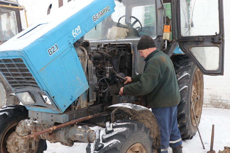 Безусловно, за февраль необходимо обеспечить стопроцентную готовность тракторного парка, особенно энергонасыщенных машин. В мехмастерской в Новоселках производит отладку и регулировку деталей тракторов «Амкодор» механизатор Валерий Калинин, а на улице чистит детали своего «Беларуса» Валерий Туманович.