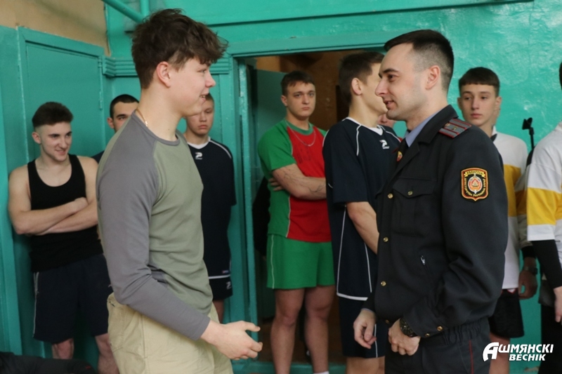 Силу и проворность юных спортсменов оценивало авторитетное жюри, в состав которого вошли представители администрации колледжа и общественных организаций. Виктор Войшнарович, директор колледжа – председатель жюри, обратился к присутствующим с приветственным словом. Он пожелал участникам достойно выступить, а также не забывать о главной миссии мужчины – защите. Виктор Иванович отметил, что в колледже получают образование достойные, сильные и смелые юноши. Присутствовал на мероприятии и начальник ИДН Ошмянского РОВД Вадим Клим, который пришел поддержать молодых людей. Ведущие Алеся Кучинская и Дмитрий Мещанович объявили о начале мероприятия.