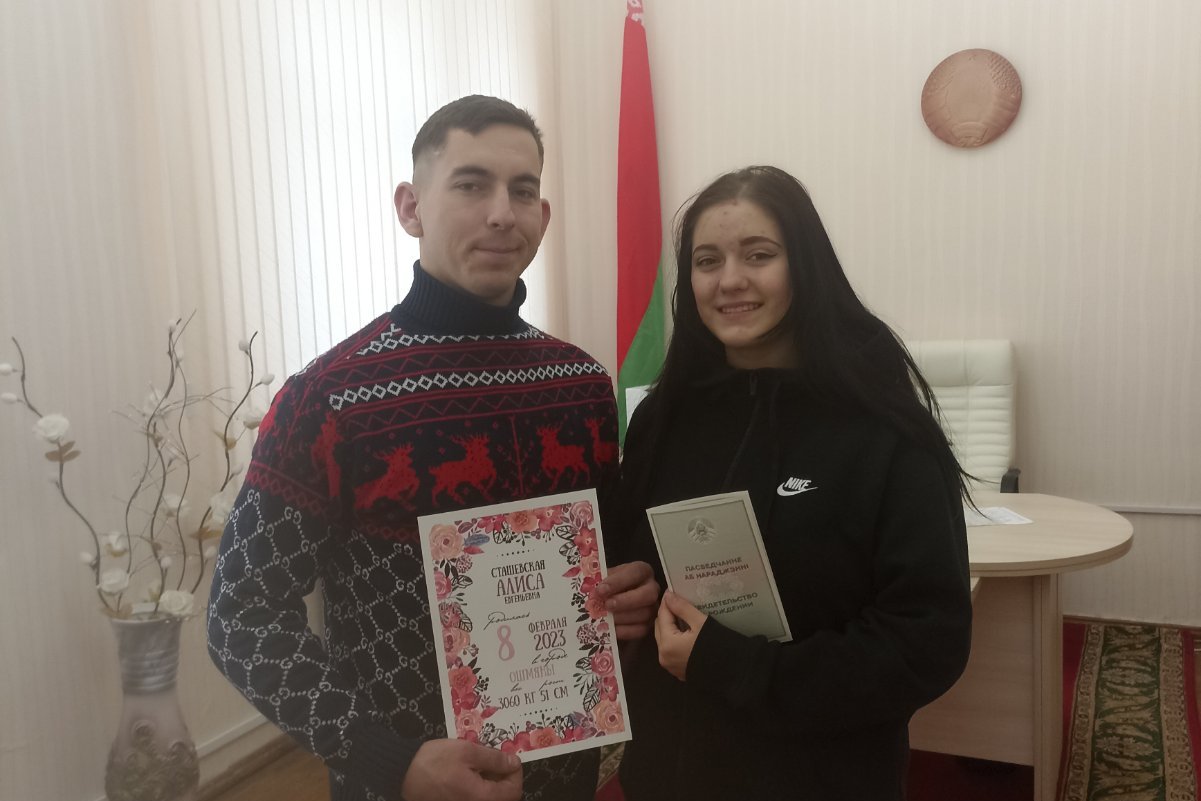 В этот необычный с точки зрения нумерологии день в ошмянском загсе состоялась торжественная регистрация рождения ошмянки Алисы Сташевской. Родители малышки специально выбрали для регистрации ребенка такой день. Евгений и Анастасия узнали, что в этом году программа зеркальной даты — пятерка, которая отвечает за динамику и активный образ жизни. Активной жизненной позиции, здоровья и счастья пожелали супругам Сташевским и их ребенку работники загса, не забыв при этом напомнить, что 23 февраля для всех белорусов особенный праздник еще и потому, что он неизменно ассоциируется с воинской славой. Именно поэтому в поздравлении звучали пожелания мира и спокойствия – в жизни маленькой белоруски, молодой семьи и нашей синеокой страны.