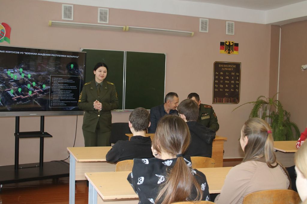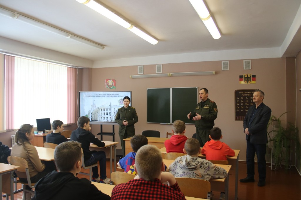 — Военная академия является ведущим вузом в стране, осуществляющим подготовку военных кадров для Министерства обороны, Министерства внутренних дел, органов пограничной службы, Комитета государственной безопасности и Министерства по чрезвычайным ситуациям Республики Беларусь. Учебно-материальная база академии позволяет качественно, на современном уровне организовать подготовку специалистов, — отметила Алина, предложив ребятам презентационный ролик об учебном заведении.