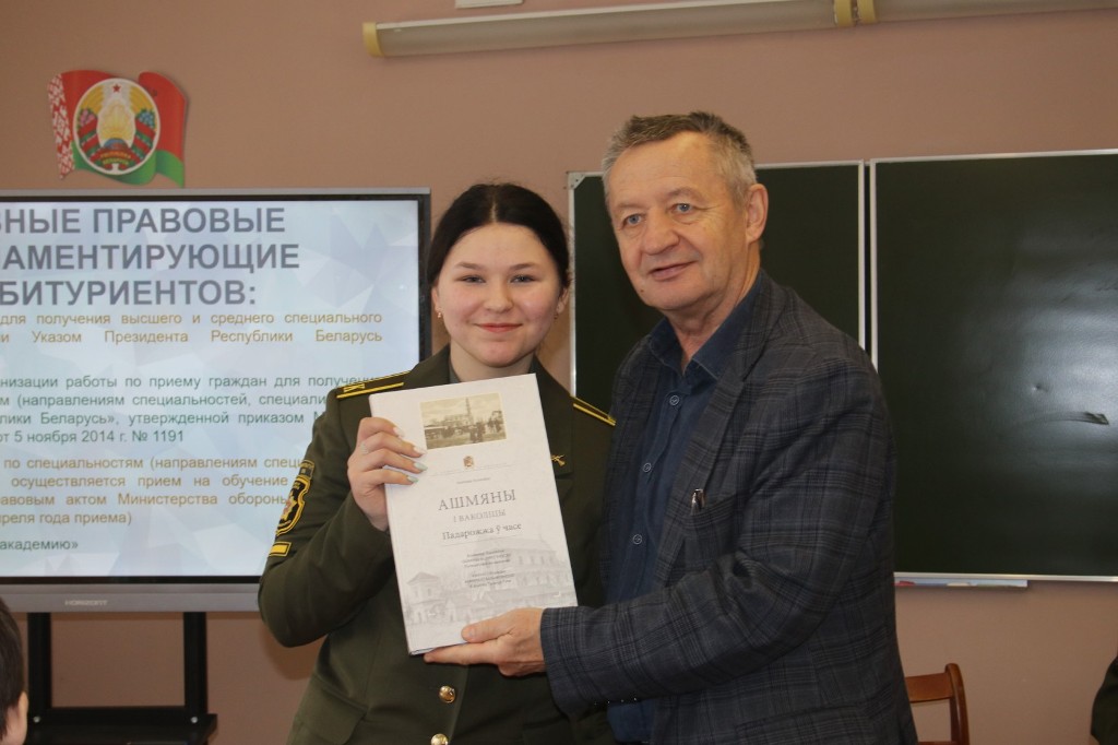 Присутствующий на встрече начальник группы призыва на военную службу военного комиссариата Ошмянского района Виталий Кишкель рассказал, что с 3 января по 1 апреля в военном комиссариате проводится предварительный профессиональный отбор кандидатов из числа гражданской молодежи для поступления в военные учебные заведения и создан пункт военно-профессиональной ориентации граждан.