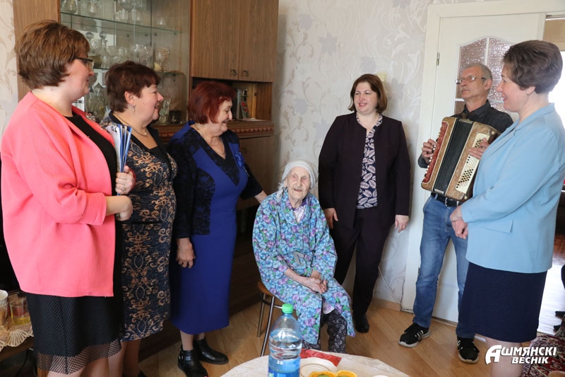 В этот праздничный день, чтобы обратиться с теплыми словами поздравлений и пожеланиями, к юбиляру приехали директор территориального центра социального обслуживания населения Ошмянского района, депутат Ошмянского районного Совета депутатов Лилия Неверкевич, начальник управления по труду, занятости и социальной защите, член районной организации РОО «Белая Русь» Ирина Губарева, начальник отдела ЗАГС Инна Подъельская, специалист по социальной работе территориального центра социального обслуживания населения Диана Куприянюк, а также посетители отделения дневного пребывания для граждан пожилого возраста ТЦСОН.