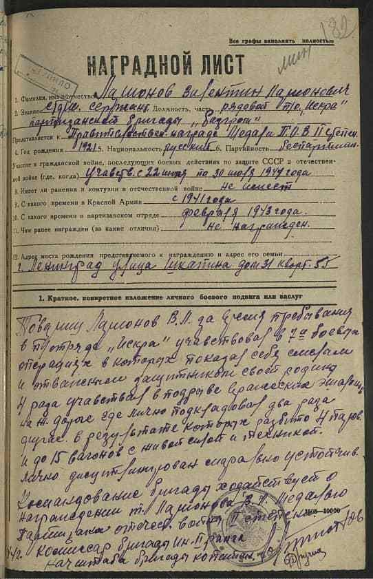 Падчас камандавання атрадам “Іскра” Валянцін Ларыёнаў удзельнічаў у сямі баявых аперацыях, у якіх паказаў сябе смелым і адважным абаронцам Радзімы. Чатыры разы ўдзельнічаў у падрыве варожых эшалонаў на чыгунцы, у выніку чаго разбіты чатыры паравозы, каля 15 вагонаў з жывой сілай і тэхнікай.