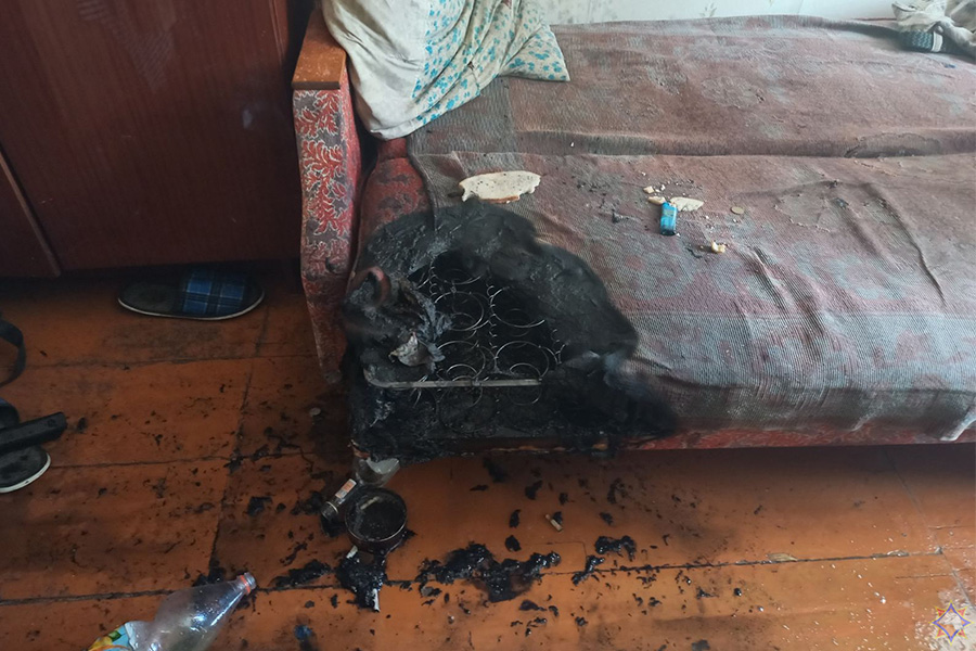 Спасатели ликвидировали пожар. Огнем поврежден диван, постельные принадлежности.