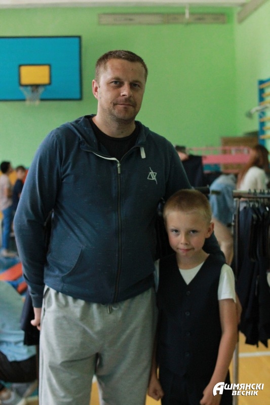 Третьеклассник Миша Шлыкович пришел за новенькой формой вместе с папой Юрием. Папа заметно нервничает, ведь в этом году мама не участвует в ответственной миссии. Юрий делает несколько фото с разного ракурса и отправляет супруге. Миша послушно позирует, время от времени посматривая на новенький костюм.