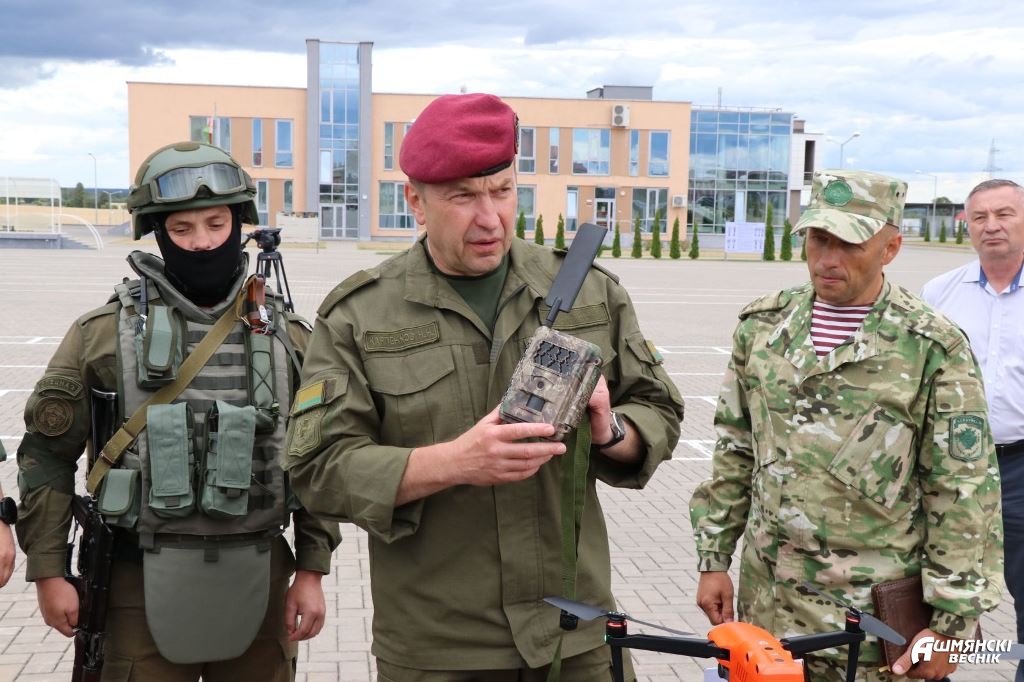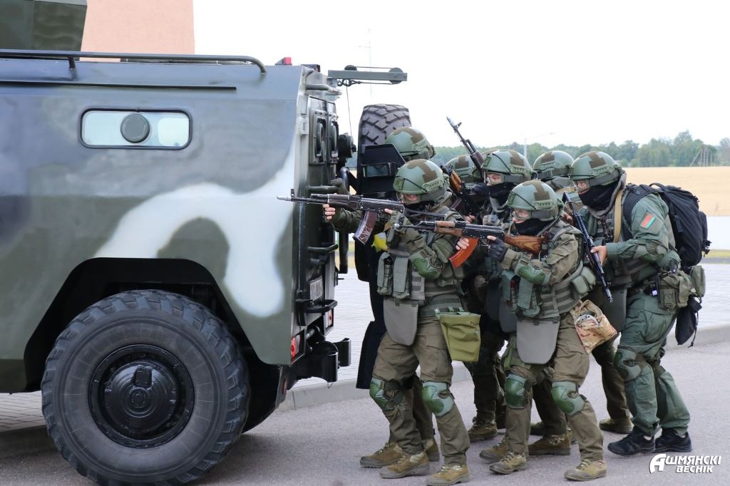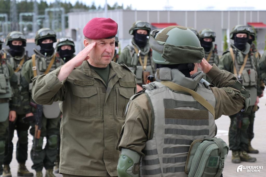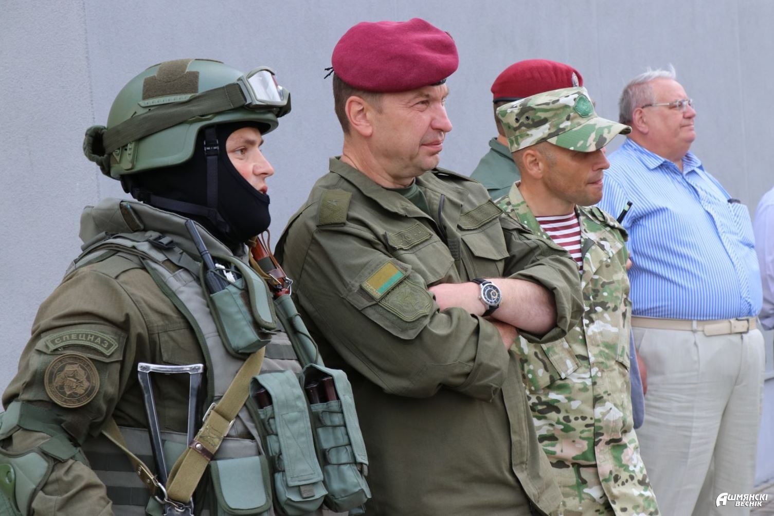 Заместитель министра внутренних дел — командующий внутренними войсками Николай Карпенков вместе с командиром специального отряда быстрого реагирования внутренних войск МВД Беларуси Александром Быковым, командиром войсковой части 7434 Сергеем Лойко и руководством Белорусской атомной станции оценили оснащение и готовность нового подразделения специального назначения в Островце.