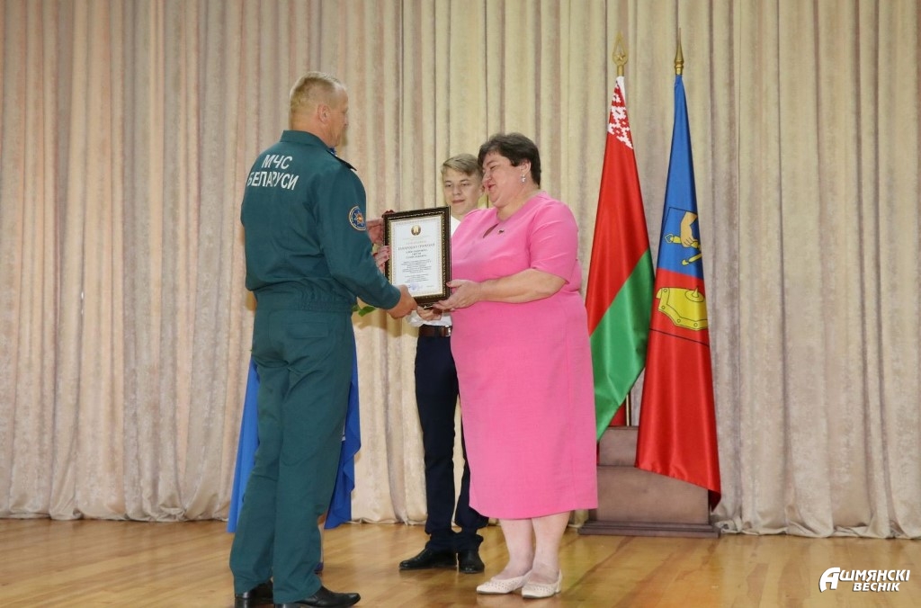 Слова поздравлений в этот праздничный день адресовала спасателям заместитель председателя Ошмянского районного Совета депутатов Раиса Турлай. Пожелав виновникам торжества здоровья и благополучия, Раиса Николаевна вручила Почетные грамоты районного Совета депутатов сторожу склада материально-технического обеспечения и обслуживания Александру Орпику и старшему инструктору-спасателю ПАСЧ-1 Сергею Александровичу. Благодарственные письма районного Совета депутатов принимали заведующий складом материально-технического обеспечения и обслуживания Михаил Вабищевич и сторож Андрей Галамбовский.