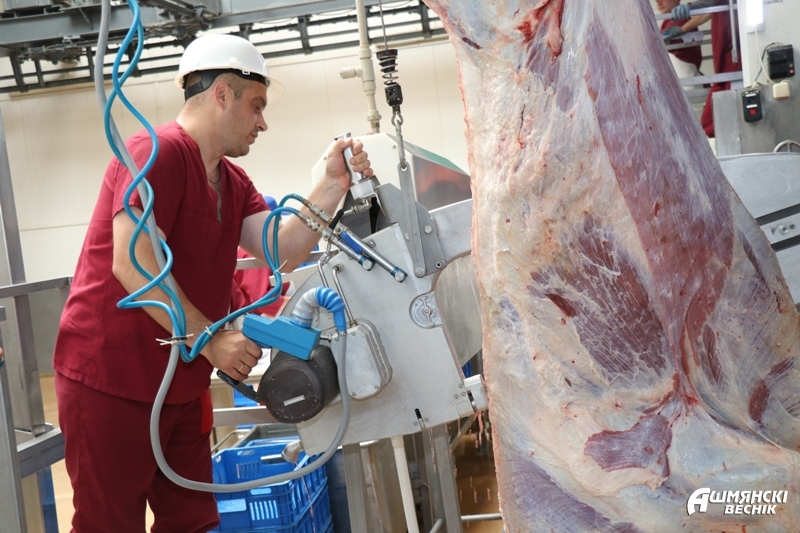 В цеху происходит постоянное движение. Вот двое работников, Виктор Разумник и Иван Окулевич ловко и быстро выполняют одну из наиболее трудоемких и ответственных операций – отделяют шкуры от туш животных. Делать это нужно быстро и в то же время аккуратно, так как при наличии порезов снижаются качество и сортность шкуры, а при наличии выхватов мяса и жира снижаются выход мяса, его качество и продолжительность хранения. Дальше происходит распиловка туши. Видно, что эта работа привычная и хорошо знакомая для Анатолия Заянчковского, так как он справляется с ней за несколько минут, а на подходе – следующая туша. Внутренние органы тоже нужно извлекать осторожно, чтобы не повредить желудочно-кишечный тракт, ливер и внутреннюю поверхность туши. А времени – в обрез. С этой работой справляются Александр Первенис и Эдуард Субоч на следующем участке. Обработчики туш Ирина Остик, Ирина Строцкая и Ирина Подворская удаляют побитости и кровоподтеки, срезают пленки, обезжиривают туши.