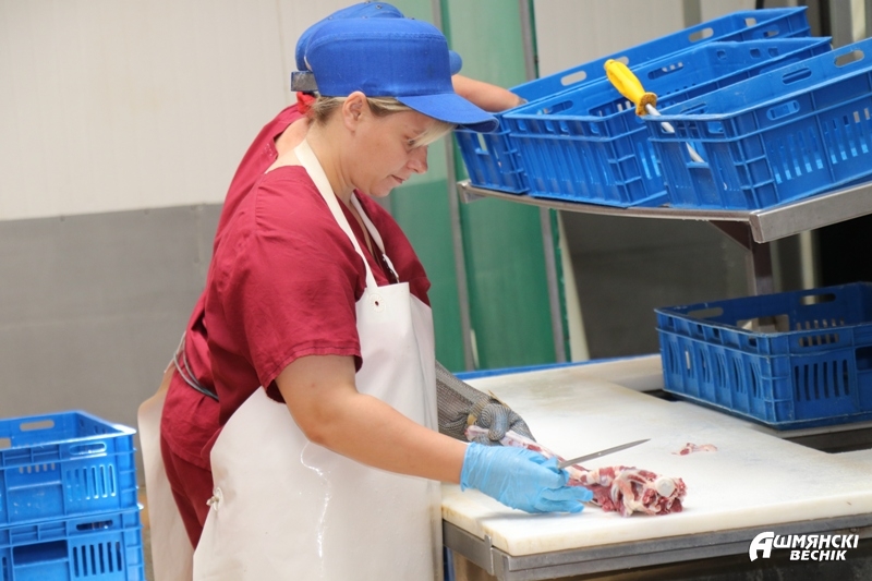 Для того чтобы мясное сырье было качественным, все технологические операции в цеху надо производить максимально быстро. Времени на отдых и разговоры здесь нет. Процесс переработки включает в себя большое количество операций, работа здесь кипит, не останавливаясь ни на минуту. От начала убоя животного и до транспортировки разделанной туши в холодильник проходит от 40 минут до часа, а за смену, которая длится с 10.00 до 19.00, в цеху обрабатывается в среднем 120 единиц крупного рогатого скота и 320 свиней. Поставщики скота – сельскохозяйственные предприятия Ошмянского, Островецкого, Ивьевского, Сморгонского и Вороновского районов.