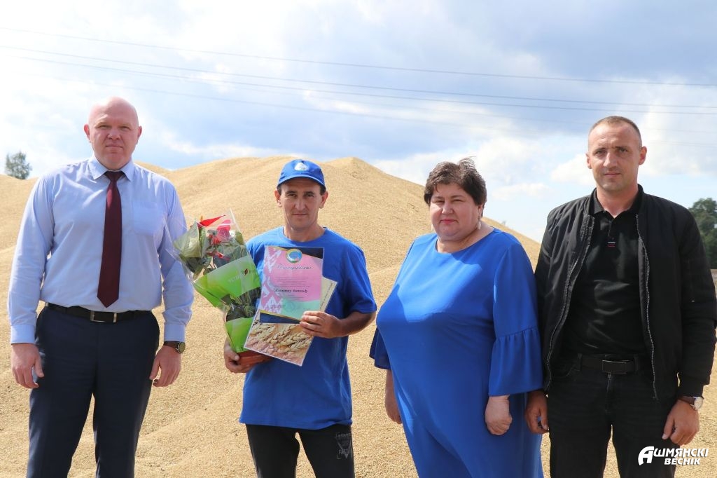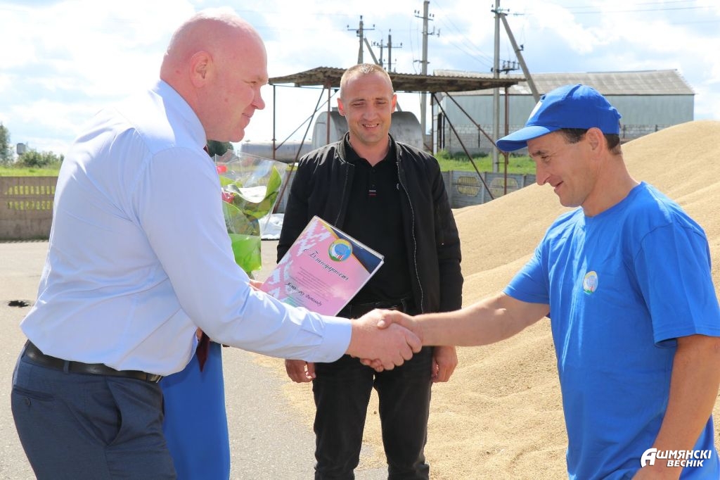 Андрэй Гардзей падзякаваў вадзіцелю-тысячніку за плённую, добрасумленную працу і актыўны ўдзел ва ўборачнай кампаніі і ўручыў яму грашовыя сертыфікаты, а Раіса Турлай – кветкі.