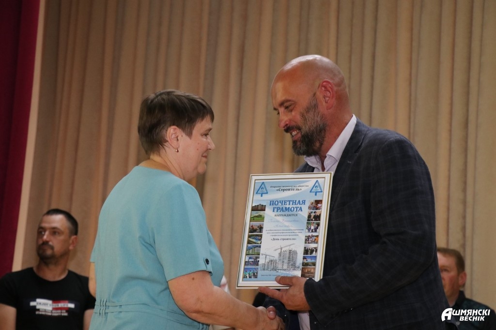 Заместитель директора по строительству ОАО «Строитель» Петр Лагунович награжден нагрудным знаком Министерства архитектуры и строительства «Ганаровы будаўнік». Почетная грамота Министерства архитектуры и строительства, а также Благодарственное письмо председателя Гродненского облисполкома вручены начальнику участка электромонтажных работ ОАО “Строитель” Леониду Петюлевичу. Штукатур ОАО “Строитель” Мария Пашникович и каменщик-плотник ООО “Гранит+” Марьян Поплавский принимали поздравления в связи с награждением Почетной грамотой Ошмянского районного исполнительного комитета. Благодарственным письмом председателя Ошмянского районного исполнительного комитета отмечены добросовестный труд и профессиональное мастерство ведущего инженера КУДП “Управление капитального строительства Ошмянского района” Екатерины Кульпекша, плотника-бетонщика ОАО “Строитель Алексея Чекаловского, бетонщика ОАО “АГАТ-стройсервис” Сергея Дробыша, облицовщика-плиточника ООО “Гранит+” Александра Мизуло.