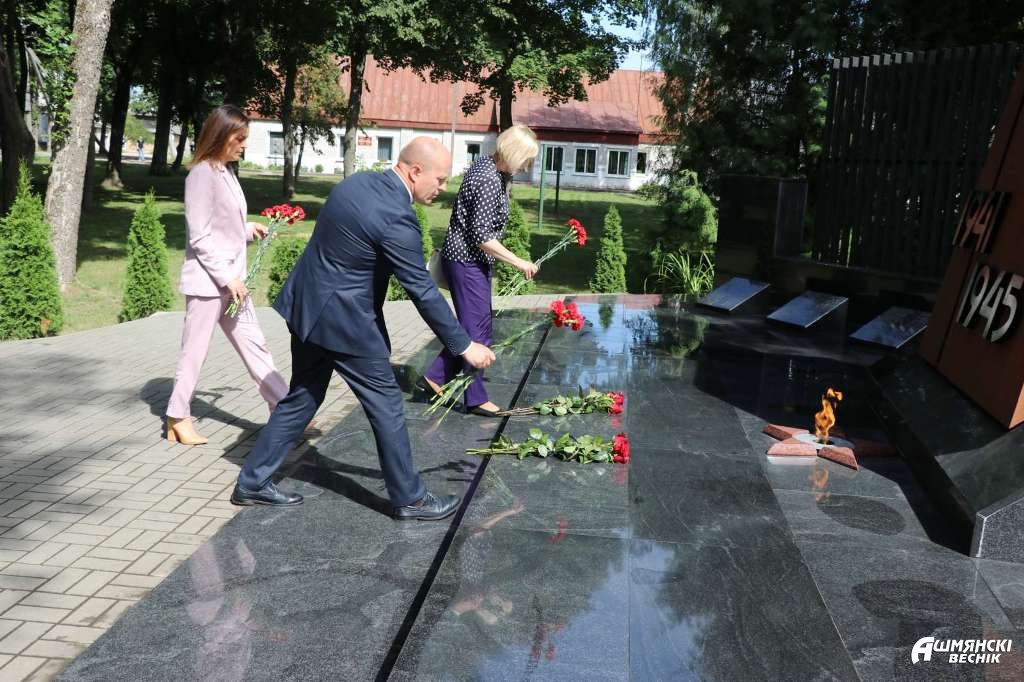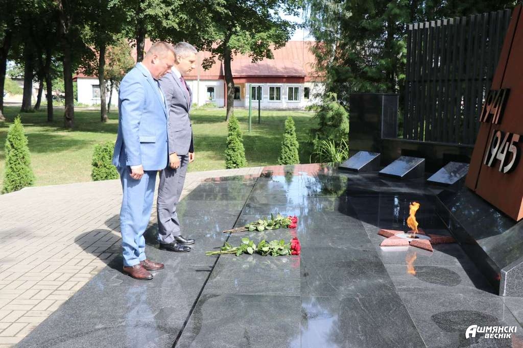 Сергей Хоменко с Владиславом Гершгориным возложили цветы к братской могиле в городском парке. Глава Министерства подарил руководителю нашего района научно-популярное издание «Архивы. Ничего, кроме Правды», изданное Министерством юстиции Республики Беларусь совместно с Белорусским телеграфным агентством. В издание вошли новые выявленные архивные материалы, свидетельствующие о преступлениях нацистов и их пособников против мирного населения на оккупированной территории БССР в годы Великой Отечественной войны.